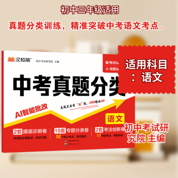 图书简介 | | 《中考真题分类语文》是专为初中生设计的中考语文复习试卷,紧密围绕中考考纲与命题趋势,整合全国各省市经典真题,通过科学分类与系统训练,助力学生高效突破考点、提升应试能力。本试卷设置摸底小卷,可帮助学生在做题的过程中快速定位薄弱环节;分类卷按“语言积累与运用”“古诗文阅读”等模块划分,细分记叙文阅读、文言文翻译等核心考点;新考法板块聚焦多种新兴题型,紧跟新课标改革方向。本试卷是中考语文备考的必备提分利器。 |