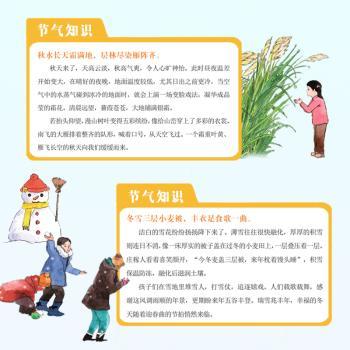 图书简介 | | 本书以主人公牙牙一家跟随节气顺时生活、观察自然为故事主线,以二十四节气为时间线索,每页一句歌词,展现了各个节气的典型物候现象和民俗农事活动,通过朗朗上口、易于传唱的歌词,让孩子潜移默化熟记节气博物知识。手绘插图清新唯美,能够激发孩子亲近自然的情感。全书最后设有歌词解读板块和无障碍手语课视频,期待为小读者带来视觉与听觉的双重愉悦,解锁“听”懂大自然语言的更多方式。 |