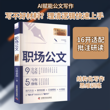 图书简介 | | 本书从职场写作中最常见的九大场景入手——工作计划、工作总结、工作方案、述职报告、发言稿、心得体会、调研材料、事迹材料、机关公文,逐一拆解每一类写作任务的基本逻辑、实用技巧、避坑经验和常用模版,并辅以5项写作素养提升及AI工具赋能,帮助读者进一步提升写作能力。 |