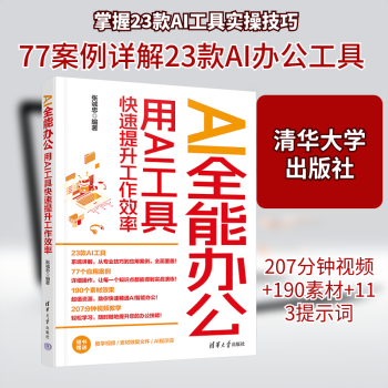 图书简介 | | 本书通过77个案例,全面介绍了AI办公的23种工具与77个技巧,并赠送207分钟同步教学视频+190个素材效果文件+113组实例提示词。23款AI办公工具分别是:通义、橙篇、百度文库、腾讯文档、讯飞智文、Boardmix、文心一格、即梦AI、可灵AI、剪映、海绵音乐、Kimi、天工AI、ChatGPT、智谱清言、文心一言、秘塔AI搜索、360智脑、PiccoPilot、讯飞星火、腾讯智影、豆包、扣子。23个行业领域的具体应用是:咨询提问、文案创作、文档处理、表格制作、PPT制作、思维导图、绘图设计、摄影创作、视频生成、剪辑、音乐创作、行政人力、编辑出版、教学、诗词创作、短剧写作、活动策划、产品运营、电商、市场营销、直播卖货、数据分析、智能客服。 |