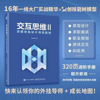 图书简介 | | 本书分为新手篇、筑基篇、通识篇、成长篇四大部分,浓缩了作者作为体验设计师在工作、生活中的长期积累,也是其对自身能力的总结和思考。新手篇讲解了什么是技能树,让读者对体验设计师技能树的概念及如何利用技能树进行学习、提升形成初步认识;筑基篇详细讲解了体验设计师的四大关键职业技能——思维、眼界、手段和精神;通识篇详细讲解了设计师应具备的基础技能——学习能力、思辨能力、沟通能力和执行能力;除了前面讲解的关键技能,成长篇则讲述了体验设计师的工作经验和职场心得,作者通过讲述自己的工作成长经历及坚持1000天写作的亲身经历,让读者深刻体会到工作中成长与学习的重要性。 |