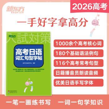 图书简介 | | 本书是一本为参加高考日语的考生练习书写高考核心词汇和语法句型的字帖。本书共分为三章,第一章为高考日语核心词汇,基于高考日语大纲和历年高考日语真题选出核心词汇,给出音调、词性及释义等;第二章为基础语法练习,给出高考常考的基础语法例句,强化学生的基础语法知识;第三章为高考常考句型,包括高考常考句型及例句。本书内容设置合理,包含高考日语核心词汇、基础语法例句和高考常考句型例句三个部分,难度适中,符合高考日语学生的学习需求。书中所有例句均给出了中文翻译,同时在句中用颜色标记了语法点,方便考生重点记忆语法知识。 |
