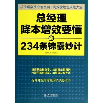 图书简介 | | 降本就是砍掉成本、消除浪费。企业家只要做两件事,第一增加收入,第二控制成本。增效就是提高效率、增加效益。增加效率的结果就是增加效益,同时也是增加收入、增加利润。本书从总经理管理的实际出发,为读者提供了234条实用的建议,很多新鲜的、可操作的实例也都被加入其中。 |