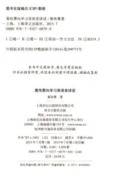 图书简介 | 这本选集是从葛传椝先生的三本选集——《葛传椝英文集(Man and Student)》、《英文刍言(A Word to the Wise)》和《英文作文教本(A Textbook of English Composition)》中选出论述学习英语的三十七篇文章编成的。每篇揭示一个或两个问题,大都是英语语法书和英语修辞学书所不曾讲到的。内容谈到什么读物是初学者需要读的和什么是不宜读的;怎样才能读得精细;说、读和写的关系;以及拘泥语法条条,一概类推所造成的错误等问题。 |