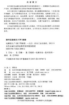 图书简介 | | 本书主要介绍了电解铝基本理论知识、铝电解槽的焙烧启动、工艺技术条件和操作、生产异常情况及处理、生产事故处理及预防、电解烟气净化工艺、铝及铝合金铸造工艺等。 |
