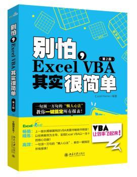 图书简介 | | 本书内容由浅入深,从简单的宏录制、VBA编程环境和基础语法的介绍,到常用对象的操作与控制、Excel事件的调用与控制、用户界面设计、代码调试与优化、都进行了形象的介绍。 |