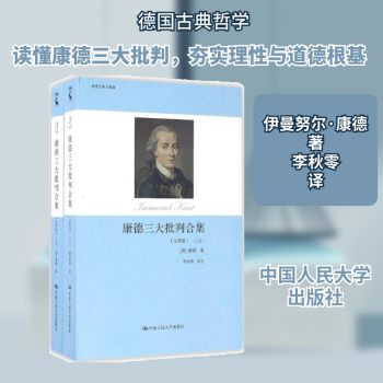 图书简介 | | 本书为《纯粹理性批判》、《判断力批判》、《实践理性批判》合集。其中,《纯粹理性批判》以第二版为基准,凡是第一版与第二版有异之处,文字较少者均以脚注的方式标出,文字较多者则附于合适的点,三部著作军增译了《科学院版编者导言》和科学院班编者注,并在必要的地方加了少量的译者注。 |