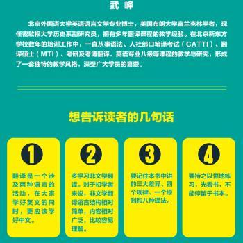 图书简介 | | 本书共安排十二天内容,前七天主要讲解英译汉,内容分别为翻译英语中的定语从句、被动语态、代词及形容词和副词;后面五天主要讲解汉译英,内容分别为增词与减词、换主语、中西方文化差异的翻译和总结非文学翻译的特点。 |