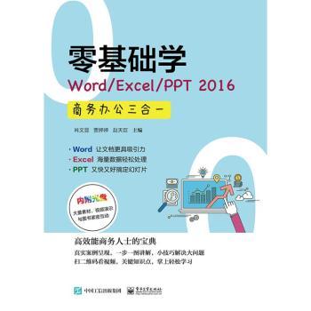 图书简介 | | 本书是指导初学者学习Word/Excel/PPT 2016的入门书籍,概述详细地介绍了初学者学习Word/Excel/PPT时应该掌握的基础知识、使用方法和技巧,并对初学者在学习过程中经常会遇到的问题进行了专家级的解答,希望每位阅读本书的读者,都能提高办公效率,早做完,不加班!全书分3篇,共13章,第1篇“Word办公应用”介绍Word 2016的基本操作、文档中的表格应用、Word高级排版;第2篇“Excel办公应用”介绍工作簿和工作表的基本操作、美化工作表、图表与数据透视表,排序、筛选与汇总数据,数据处理与分析、公式与函数的应用、简易宏与VBA等内容;第3篇“PPT设计与制作”介绍编辑与设计幻灯片、动画效果与放映。 |
