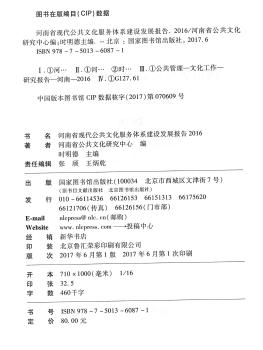 图书简介 | | 本书是关于2016年河南省现代公共文化服务体系建设发展的综述报告,全面阐述了河南省在“十三五”的开局之年,根据“四个河南”的战略部署,加大公共文化设施建设力度,提升公共文化服务效能,在公共文化服务的标准化、均等化、社会化、数字化等方面取得的成绩。报告总结了河南省在公共文化服务体系建设的经验,能为健全公共文化服务体系、完善制度规范、提升服务效能、促进三区建设、开拓互联网+公共文化服务等工作的开展,实现河南省公共文化服务的跨越式发展,提供经验和启迪。 |