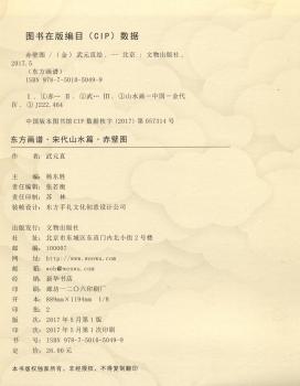 图书简介 | 本幅作品取材于苏轼赤壁泛舟之景。画大江峭壁以斧劈皴法, 表现石块的嶙峋与坚实, 树木细小而茂密, 峰石只略加皴染。江水波浪激涌处, 一小舟顺流飘然而下, 舟上三人泰然而坐, 似在吟诗作赋, 指点江山, 人物虽小, 其精神面貌却可得其大略。 |
