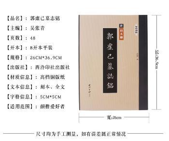 图书简介 | | 《郭虚己墓志》1997年10月出土于河南省偃师市首陽山一座唐代土洞墓中。该墓志高107厘米、宽104厘米,蓋顶篆书“唐故工部尚书赠太子太师郭公墓志铭”十六字。正文为楷书,35行,满行34字,共有1150字。《郭虚己墓志》为颜真卿四十岁时所书,比《多宝塔碑》还要早三年,是目前发现的最早的颜氏书法作品。 |