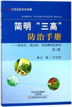 图书简介 | | 本书在第一版的基础上修订而成,以问答的形式分别介绍了高血压、高脂血症、糖尿病的基本概念、判定标准及对人体的危害,重点讲述了用于防治“三高”(高血压、高血脂症、高血糖)病症的药物特点、临床合理运用的方法、调脂药和降糖药的作用及使用注意事项等,同时介绍了日常生活调养等非药物治疗方法。本版新增了近年来修订的关于以上三种疾病的“防治指南”和“专家共识”,以及笔者临床经验和心得体会等内容。 |