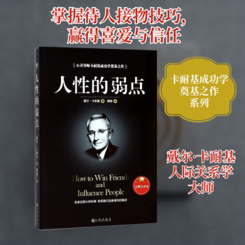 图书简介 | | 《人性的弱点》是戴尔·卡耐基的励志经典图书,全球自我教育与成人训练的范本。1937年出版,世界各地至少已译成58种文字,全球总销量九千余万册,拥有4亿读者。本书旨在帮助读者解决所面临的问题:如何在日常生活、商务活动与社会交往中与人打交道,并有效地影响他人;如何击败人类的生存之敌——忧虑,以创造一种幸福美好的人生。 |