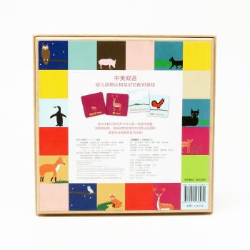 图书简介 | | 一个集合了动物认知、英语启蒙的综合益智类游戏。盒内有63张卡牌和一张大海报,共包含了31对动物。孩子通过给动物配对,如骆驼camel——骆驼宝宝calf,蝴蝶butterfly ——毛毛caterpillar,来学习中、英文中成年动物与幼年动物的不同叫法。这还是一个记忆力训练的游戏,目的是尽可能多的帮助动物宝宝找到它们的父母。盒内含有游戏说明,是一款适合全年龄段操作的益智桌游。 |