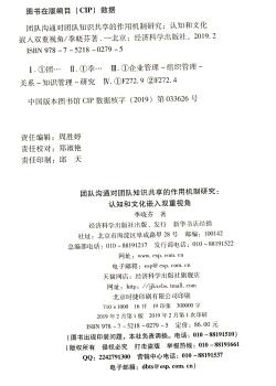 图书简介 | 本书探讨了中国文化背景下团队沟通的主要形式和方式,从认知视角研究了企业团队成员从沟通开始引致知识共享的机制,揭示了组织文化在组织知识共享中的作用,为国内企业的知识共享管理实践提供理论与实证依据。 |