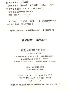 图书简介 | | 本书共分作九章:第一章旨在建立市场营销以及旅游市场营销和旅游市场营销学的基本概念;第二章主要讨论旅游者以及组织机构的旅游购买行为;第三章对旅游市场细分、目标市场选择以及在目标市场中的产品定位进行分析;第四章介绍旅游营销信息的主要内容以及旅游营销调研的主要方法;第五章阐述旅游市场营销计划的类型以及旅游市场营销计划的制定过程;第六章至第九章分别讨论旅游产品策略、旅游产品定价、旅游促销和旅游产品的销售渠道策略。 |