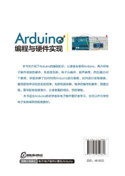 图书简介 | | 本书先介绍了Arduino的基础知识,让读者会使用Arduino,再介绍电子制作用到的硬件,包括面包板、电子元器件、扬声器等,然后通过40个案例,详细讲解了如何利用Arduino进行编程、如何进行实物搭建,最终获得声光电的实验效果,包括电路讲解、程序的编写和解析、搭建过程。图书配有视频演示,让读者看的明白、学的清楚。 |