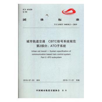 图书简介 | | T/CAMET 04018的本部分规定了城市轨道交通CBTC信号系统中ATO子系统的一般要求、环境务件、性能要求、功能要求、接口与通道要求、电磁兼容防护要求、供电及电源设备要求等。 |