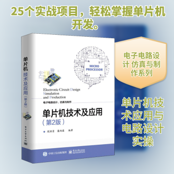 图书简介 | | 本书介绍了25个典型的单片机技术设计案例,包括数字电压表设计、直流电动机控制模块设计、步进电动机控制电路设计、电子密码锁设计、数字时钟电路设计、基于DS18B20的温度测量模块设计、信号发生器设计、基于模糊控制的温度控制电路设计、催眠电路设计、电子治疗仪电路设计、室内天然气泄漏报警装置设计、数控稳压电源设计、转速测量系统设计、电子烟花点火电路设计、乒乓球比赛模拟电路设计、数字频率计设计、多功能万年历设计、交通灯电路设计、函数发生器设计、太阳能手机充电器设计、心电信号检测与显示电路设计、脉搏信号检测与分析电路设计、基于单片机的电子秤设计、基于单片机的公交车自动报站器设计、计分器电路设计。 |