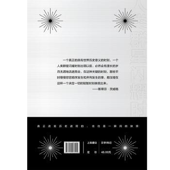 图书简介 | | 本书讲述了拿破仑、歌德、托尔斯泰、西塞罗、列宁、威尔逊等伟人的历史性时刻,以独特的视角,展开14个历史特写,刻画14位时代英雄,记录了影响世界历史进程的14个精彩瞬间。 |