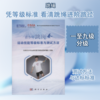 图书简介 | | 本书介绍了青少年跳绳运动技能等级标准与测试方法,主要内容包括“测试场地、器材、设备及人员配备要求”“测试的总体要求”“各等级测试科目”“一~九级测试方法”。各级测试方法中规定了该级测试的科目、评分方法、达标标准,并对测试过程中的要点辅以图示及说明。 |