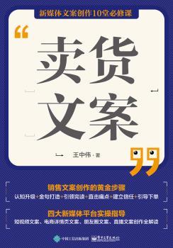 图书简介 | | 本书是一本销售文案创作指南,能为读者提供系统的销售文案创作方法,并详细分析了转化率高的销售文案背后的创作逻辑及必备要素。通过阅读本书,读者能够掌握销售文案创作的基本思路和框架,以及能让销售文案卖货的技巧和经典模式。本书还逐一介绍了新媒体与电商崛起背景下,几种新兴的销售文案形式的创作方法,包括短视频销售文案、电商销售文案、朋友圈销售文案和直播销售文案,适合短视频平台自媒体从业者、电商平台经营者、微商从业者、直播平台从业者阅读。 |