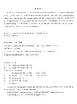 图书简介 | | 本书共14章,深入浅出地介绍了ASP.NET Core基础及项目开发方面的知识。主要内容有.NET Core基础知识、ASP.NET Core开发工具的使用、ASP.NET Core的原理和特性、Razor页面、MVC、Blazor、EF Core、Dapper、ASP.NET Core Web API、SignalR、gRPC、身份验证、NetNote系统等。除此之外,还从零开始讲解一个完整的ASP.NET Core Razor页面项目的开发、发布及部署,带领读者走进ASP.NET Core项目开发。使用ABP框架创建了一个图书管理项目,深入源码了解其原理和思想。 |