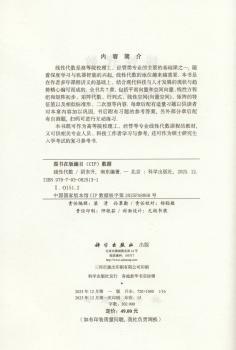 本书共5章,包括行列式、矩阵、线性方程组、矩阵的对角化和二次型,介绍了线性代数的基本理论和方法。该书注重对基本概念、定理和公式的介绍。