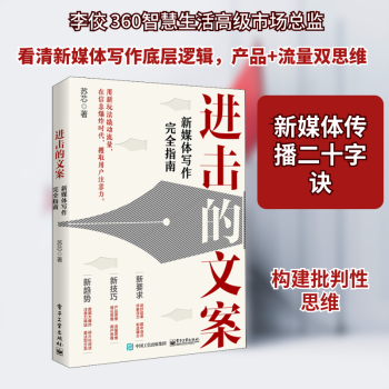 图书简介 | | 本书从这一原点出发,介绍了新媒体时代的信息传播规律,以及新媒体文案创作者应该具备的各种技能,帮助新媒体创作者不断拓展自身能力边界的能力。这本书将为你注入全新的写作思维,让你在懂文字之外,更懂用户、懂产品、懂运营、懂增长、懂技术,成为一名复合型新媒体创作者,并熟练掌握各种类型的新媒体文案的创作技巧。 |