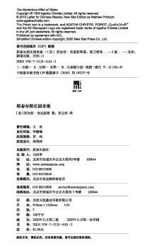 图书简介 | | 轰动一时、引起大众强烈兴趣的“斯泰尔斯庄园案”已渐渐落下帷幕,尽管如此,此案人尽皆知,我的朋友波洛和那家人都要求我把整个故事写出来。我们相信,这将有效地制止那些仍在流传的耸人听闻的传言。因此,我决定简单地写一下我和此事有关的情况。我因病从前线返乡,在一家十分压抑的康复医院里待了几个月…… |