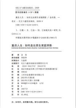 图书简介 | | 本书共分六章,内容包括:关于代际创伤;代际创伤五阶段疗法;疗愈你的内在小孩;疗愈你的身心灵;找到破解代际轮回的密钥;超越原生家庭的双向养育。 |