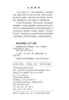 图书简介 | | 本书从掌控全局、分析本质、听话听音、修炼内心、真心打动、知人善用、有效沟通等多个方面解读作为领导应掌握的管理心理学的奥秘,帮助领导提升管理能力,高效执行管理决策。 |