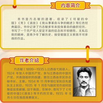 图书简介 | | 本书是方志敏的散文,也是他的遗著,图书内容收录了《可爱的中国》《死》《清贫》《我从事革命斗争的略述》等作品。在国民党监狱中被囚禁的半年时间里,面对敌人的各种威逼和诱降,方志敏大义凛然,坚贞不屈,生命不息,战斗不止,留下了一篇篇沾染着血和汗的炽热文章。作者文中洋溢着为国为民献身的爱国思想和爱国热情,表现出一个共产党员英勇无畏、视死如归的精神和意志,是让青少年了解历史、并对其进行爱国主义教育不可多得的作品。 |