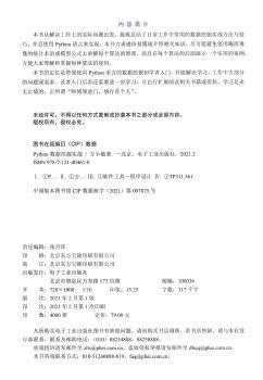 图书简介 | | 本书通俗易懂地介绍数据挖掘过程中可能用到的回归模型、分类模型、聚类、关联、时间序列分析等技术。在不影响学习理解的前提下,尽可能地避免使用晦涩难懂的Python编程、统计术语或模型公式。全书定位是带领Python数据分析初学者入门,并能解决学习、工作中大部分的问题或需求。入门后如还需要进一步进阶学习,可自行扩展阅读相关书籍或资料,学习是永无止境的,正所谓“师傅领进门,修行在个人”。 |