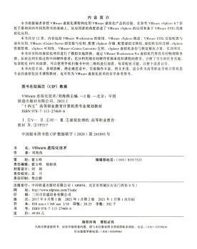 图书简介 | | 本书共分为12章,主要内容包括VMware Workstation的使用、VMware vSphere概述、VMware ESXi安装配置与基本应用、VMwarevCenter Server的安装与应用、虚拟机实时迁移、配置虚拟交换机、配置vSphere存储、VMware vCenter Converter应用、vSphere虚拟机备份与恢复解决方案、vSphere资源管理、vSphere可用性以及实训案例。本书对实际的虚拟化项目进行了模拟实施转换。通过VMware Workstation Pro虚拟机代替真实的物理服务器,从而达到实操过程中的硬件要求。 |