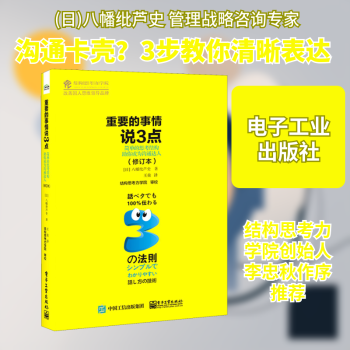图书简介 | | 三个臭皮匠赛过诸葛亮、三天打鱼两天晒网、三足鼎立、三言两语……是不是觉得“3”这个数字出镜率很高?“3”的魔法可见一斑!本书就是教你如何运用“3”的魔法来实现高效沟通,助你成为沟通达人。本书的重要内容有3点:第一点,感情;第二点,逻辑;第三点,利益。几乎所有沟通都可以从这3点来进行,给沟通另一方以充实感、创造性和安定感。重要的事情不止说3遍这么简单,重要的事情要说3点!本书就是对“重要的事情说3点”这种结构思考力的轻松解读! |