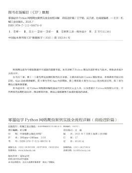 图书简介 | | 本书共7章。第1-3章为常见反爬机制的应对手段,主要内容包括Cookie模拟登录、多种类型的验证码识别、Ajax动态请求破解。第4章为手机App内容爬取。第5章和第6章为Scrapy爬虫框架应用。第7章为爬虫云服务器部署。 |