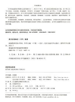 图书简介 | | 本书共分十个单元,配九套综合模拟测试练习题。每个单元由“学习目标、对话训练、快速阅读、写作技巧、补充阅读”等部分组成。每个单元一个主题,涵盖听、说、读、写、练等基本训练环节。本书主要内容侧重于旅游业的重要组成部分及最新的发展趋势,包括旅游业发展、旅行社业务、旅游咨询、导游服务、会展旅游、休闲旅游、生态旅游、旅游投诉、旅游市场营销、传统节日旅游等内容。 |