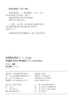 图书简介 | | 本书所选的篇章,均出自英美散文大家和哲学家之手,如英国哲学家罗素、英国小说家福斯特、美国女权主义作家苏珊·桑塔格等。这些选篇所涉及到的内容有教育、英美历史、西方社会问题、艺术欣赏和环保,等等。大部分文章都属于论述文,其论证方式和行文堪为典范,可供学生模仿。每篇课文后面均配有生词表、课文注释、配套练习等。在英语专业本科生完成了低年级的英语基础训练后,本书旨在在进一步提高他们的语言能力的同时,给他们添加西方人文传统背景知识,增进他们的阅读思考能力,使他们能批判地看待社会文化问题,并能提出自己独到的观点。 |