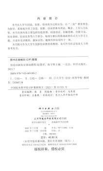 图书简介 | | 本书立足于高校大学生创造、创新、创业实际,坚持理论知识“必需、够用”的原则,注重知识与方法的应用性和实用性,以培养大学生创造能力、创新意识、创业精神为主线,将“创造、创新、创业”这“三创”教育理念融入教育教学的综合改革中,更好地培养大学生的创造、创新、创业能力。本书从大学生创造、创新、创业的全过程出发,以“三创教育”理念为指导,系统地介绍了创造、创新、创业的基本理论、概念、工具与方法等。本书具体内容主要包括创造原理、创造技法、创新思维、创新方法、创业基础、创业实务等六个部分,每部分都以四格漫画的形式引入学习主题,并设有知识学习场景和实训情境,融知识性、趣味性和实用性于一体。 |