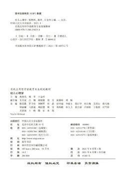 图书简介 | | 本教材内容以《3-6岁儿童学习与发展指南》《幼儿园教育指导纲要》为依据,以实用、够用、好用为立足点,从早期教育、幼儿照护、教育心理、幼儿园教师资格证考试等方面介绍了幼儿心理过程、幼儿个性心理、婴幼儿身心发展特点和规律等方面知识,建构了一个严谨而清晰的知识体系。本教材每章内容由知识树、早教之窗、拓展阅读、探究与发现、真题再现、牛刀小试几部分组成,以理论为基础,侧重培养学生实际解决问题的能力。适合作为学前教育、早期教育等专业的教材。 |