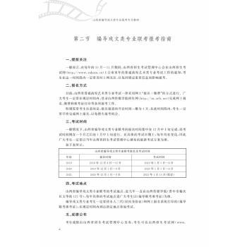 图书简介 | | 本书囊括了山西省联考各大考试题型及详解,即如何应对面试中的基本条件考查与即兴评述,如何进行才艺展示,如何搞定文学写作,以及深入评析一部影视作品的方法与技巧。全书共分三部分:山西省编导联考·政策篇、山西省编导联考·面试篇和山西省编导联考·笔试篇。 |