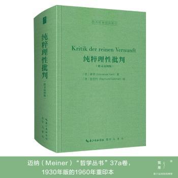 图书简介 | | 康德“三大批判”的德文版,权威的有两个版本:一为普鲁士科学院《康德全集》版,中国人民大学出版社推出的李秋零译本即依此;二为费利克斯·迈纳(FelixMeiner)出版社的“哲学丛书”版,邓晓芒和杨祖陶的译本即依此。康德的《纯粹理性批判》初版于1781年,再版于1787年,第二版对第一版的某些部分做了重大的修订或重写。所以,后来出版的《纯粹理性批判》,一般都是把两版的异文全部包含在内的合刊本,迈纳版即如此。迈纳版每隔几十年会请康德哲学专家重新修订,中译本用的是RaymundSchmidt所编订的1976年重印本,今影印该版本的1956年本。 |