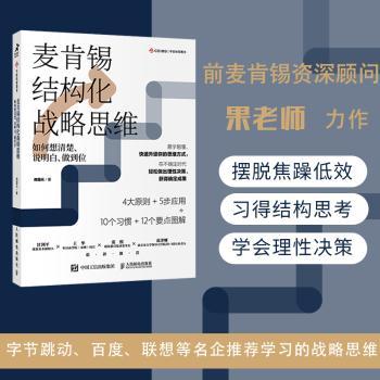 图书简介 | | 本书作者根据自己在麦肯锡工作的经验,首次体系化地从思考、交流到实施全流程,介绍了结构化战略思维,拆解了其方法论,着重介绍了“结构化战略思维四大原则”“新麦肯锡五步法”和“培养结构化战略思维需要养成的十个习惯”,同时把十二个知识要点用图解的方式做了直观呈现,以帮助我们学习并掌握“自上而下”的结构化战略思维方式和方法,让我们在VUCA时代冲破专业与经验的禁锢,以数字和逻辑为工具,自信地面对和分解问题与挑战,并能快速提出高效而有创造性的解决方案,逐渐成长为解决问题的高手。 |