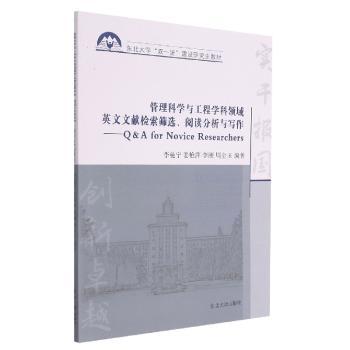 图书简介 | | 本书以管理科学与工程学科领域的一些前沿英文文献为例,主要针对学生在科研工作开展前期,特别是开题前的迷茫,整理了侧重论文的检索、阅读技巧与归纳分析的具体实用方法。 |