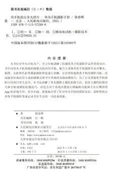 图书简介 | | 本书针对华为手机用户,全方位讲解了从基础到进阶的摄影知识。本书内容包括从基础拍摄模式的讲解到专业模式及高级拍摄技巧的探索,画质提升、景深控制、景别、焦距、构图、光影和色彩等摄影理论的讲解,从常见主题的拍摄方法、创意主题的拍摄技巧,到视频拍摄技巧的讲解,还包括从系统内置的后期编辑功能到专业后期App的探索,全面系统地介绍了针对华为手机的摄影知识。除介绍华为手机摄影的方法与技巧之外,本书还分享了大量干货知识,帮助读者将手机摄影变成记录美好生活的一项必备技能。 |