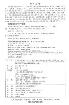 图书简介 | | 本书以Python为基础,不借助TensorFlow、PyTorch等任何框架,以浅显易懂的语言对循环神经网络RNN及生成模型中的VAE、GAN的构建方法进行了详细解说。其中在前3章对深度学习和Python编程及数学的相关知识进行了简要概括,然后依次介绍了RNN、LSTM、GRU、VAE、GAN的工作原理及编程实现,这也是本书的主要内容,最后一章作为进阶准备,介绍了最优化算法、机器学习的一些技巧以及几种便于开发、试错的数据集。 |