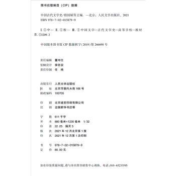 图书简介 | | 本书分六编,内容包括:先秦两汉文学、魏晋南北朝文学、隋唐五代文学、宋辽金文学、元明文学、清代文学。具体内容包括:上古歌谣和神话;《诗经》;楚辞;先秦两汉散文等。 |
