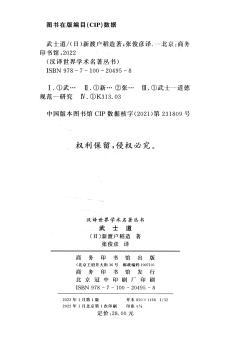 图书简介 | | 本书主要内容包括:作为道德体系的武士道、武士道的渊源、义、勇——敢作敢当、坚忍不拔的精神、仁——恻隐之心、礼、诚、名誉、忠义、武士的教育和训练、克己、自杀及复仇的制度、刀——武士之魂、妇女的教育及其地位、武士道的熏陶、武士道还活着吗等。 |